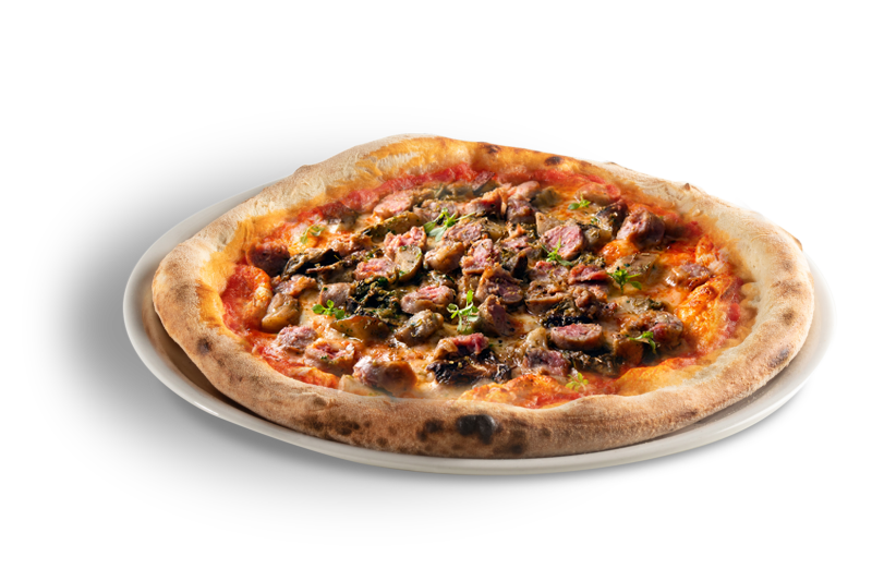 Pomodoro, mozzarella di bufala, funghi porcini*, speck